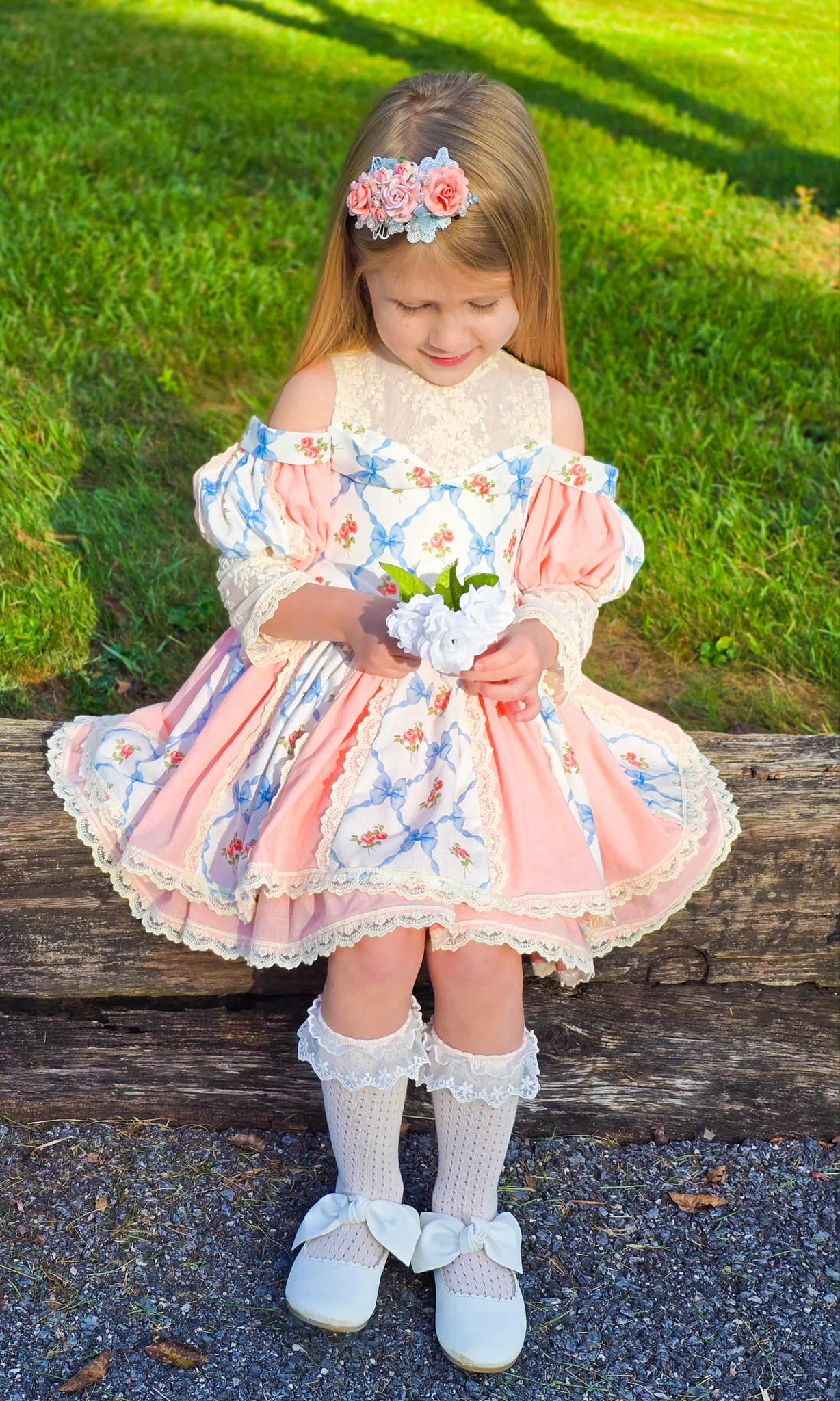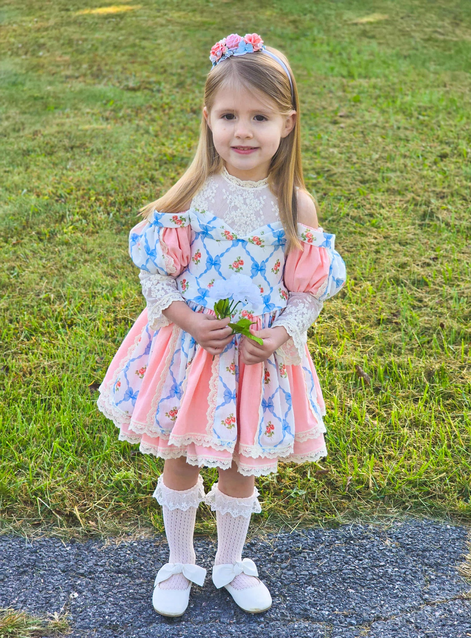 Fabric: Beautiful 100% Cotton Linen and Cotton fabrics, cotton laces and tulle puffy skirt with a full 100% cotton lining on bodice and the skirt.